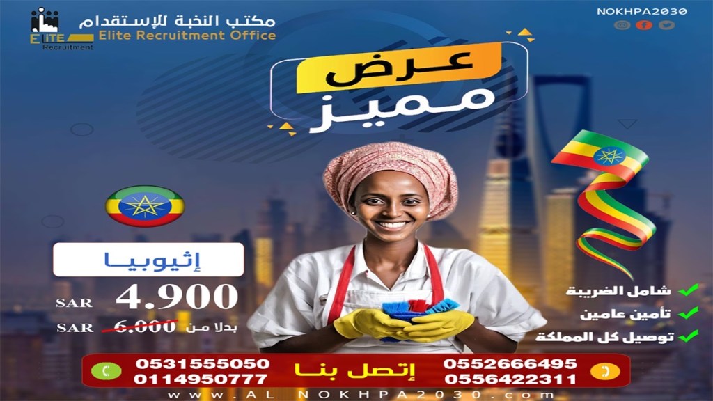 استفد من عرضنا المميز لاستقدام العاملات المنزليات من إثيوبيا بسعر 4,900 ريال سعودي بدلاً من 6,000 ريال سعودي. العاملات الإثيوبيات مشهود لهن بالأمانة والنشاط في العمل. تشمل الخدمة: