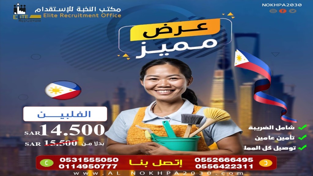 نقدم لكم عرضًا خاصًا لاستقدام العاملات المنزليات من الفلبين بسعر 14,500 ريال سعودي بدلاً من 15,500 ريال سعودي. تتميز العاملات الفلبينيات بالكفاءة والمهارة في أداء جميع الأعمال المنزلية. تشمل الخدمة: