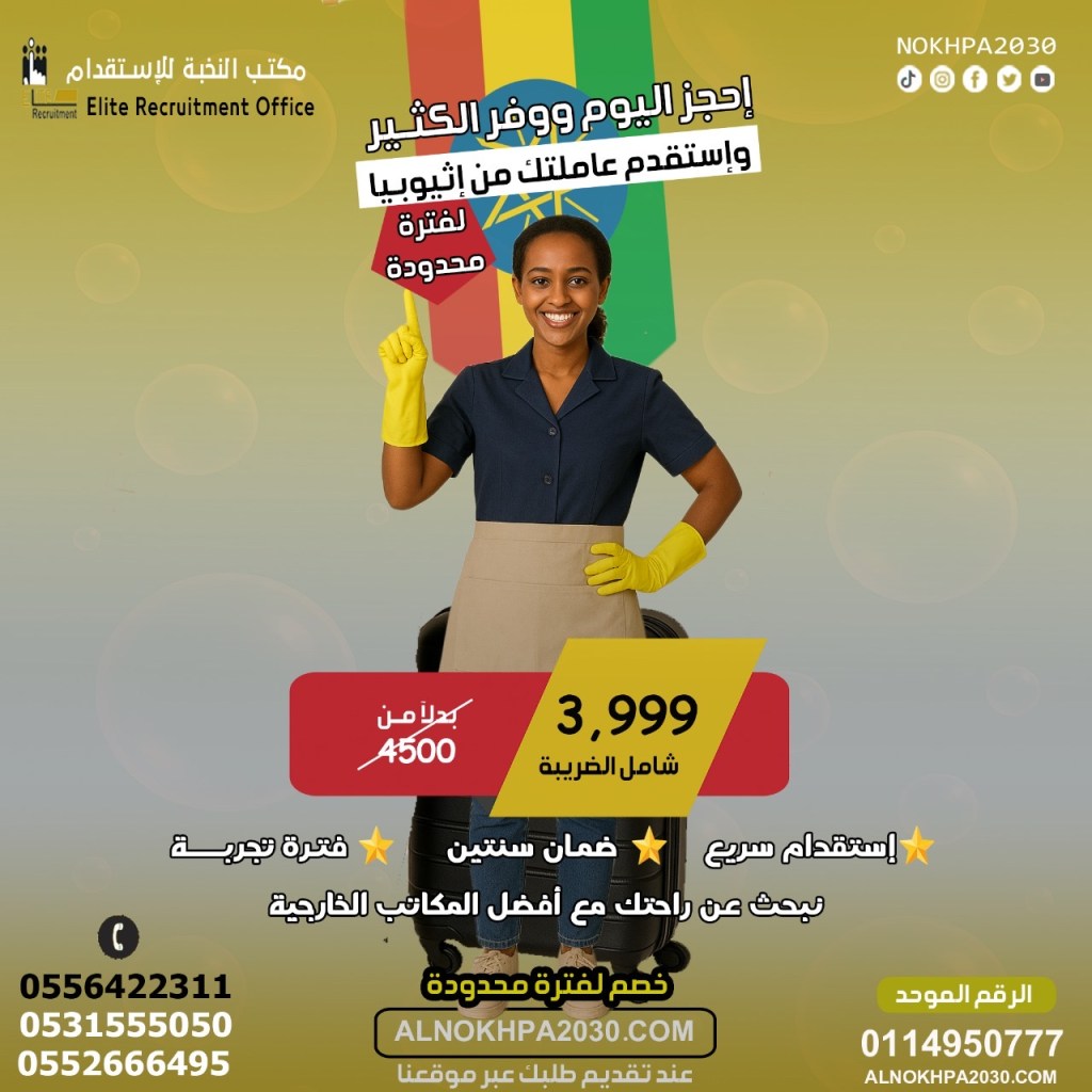 مكتب النخبة يوفر لك عروض استقدام إثيوبيا بأسعار تنافسية تبدأ من 3,999 ريال شامل الضريبة فقط، مع ضمان لمدة سنتين وفترة تجربة مريحة.