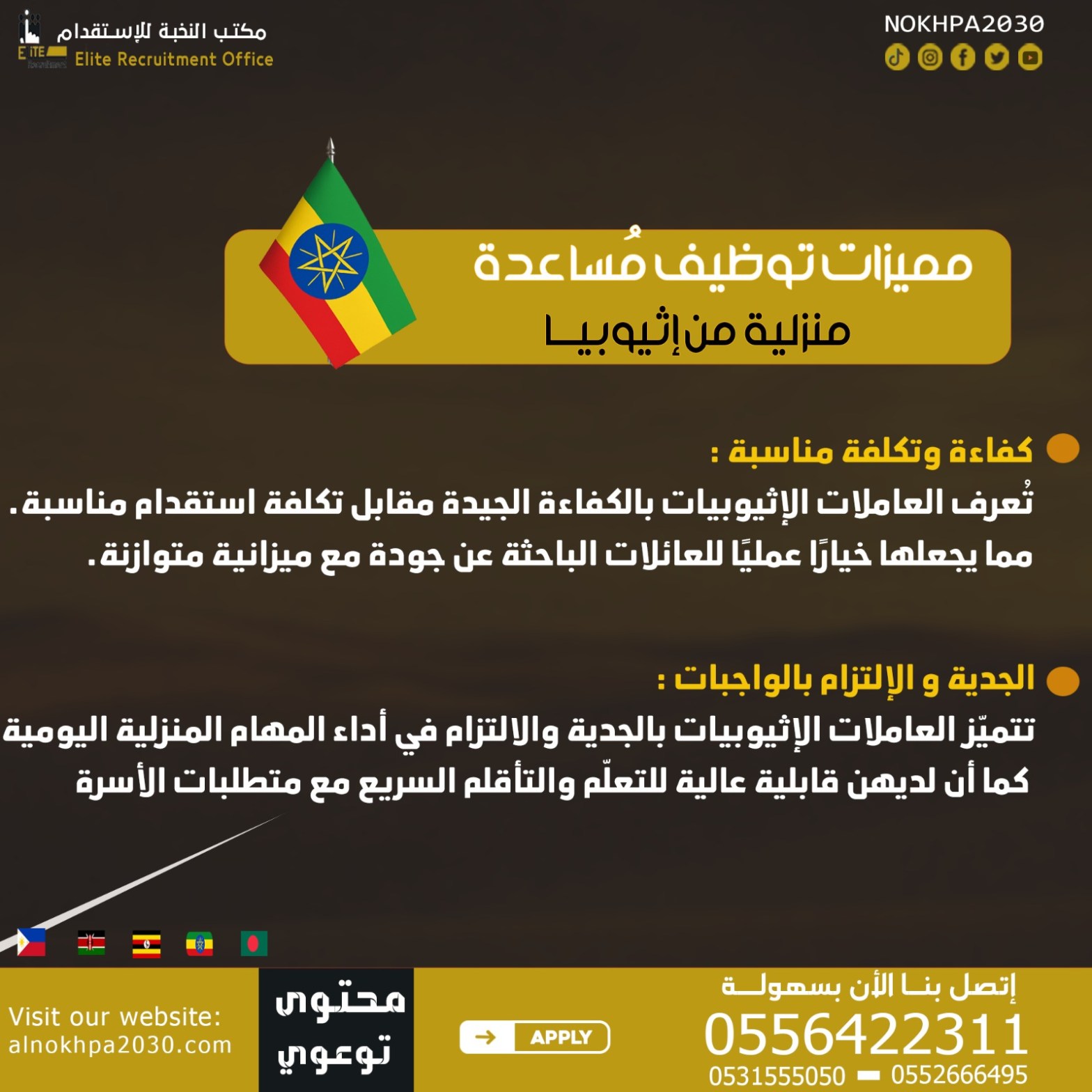 استقدام إثيوبيا بخطوات واضحة وآمنة في السعودية. تعرّف على أفضل مكتب استقدام إثيوبيا، المميزات، التكاليف، ومدة الإجراءات مع خدمة موثوقة ودعم كامل