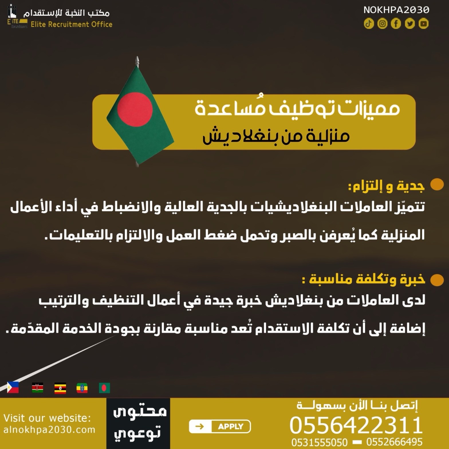 استقدام عاملات من بنغلاديش في السعودية بسعر 7,500 ريال فقط عبر Alnokhpa2030.com. إجراءات نظامية، تقديم إلكتروني، مكتب استقدام موثوق وخدمة سريعة