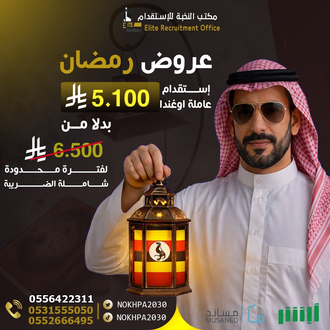 استقدام عاملات من أوغندا وكينيا بأفضل الأسعار في السعودية خلال عروض رمضان. إجراءات نظامية عبر مساند، أسعار شاملة الضريبة، سرعة في الإنجاز وخدمة موثوقة. قدّم طلبك الآن بسهولة