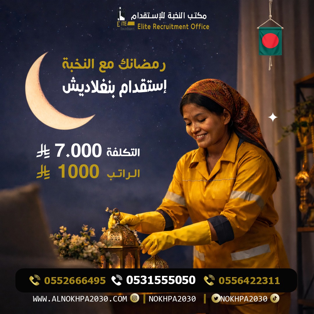 استقدام عاملة منزلية من بنغلاديش في السعودية بتكلفة 7000 ريال فقط وراتب 1000 ريال. عرض رمضان حصري من مكتب النخبة للاستقدام مع إجراءات سريعة وخدمة موثوقة.