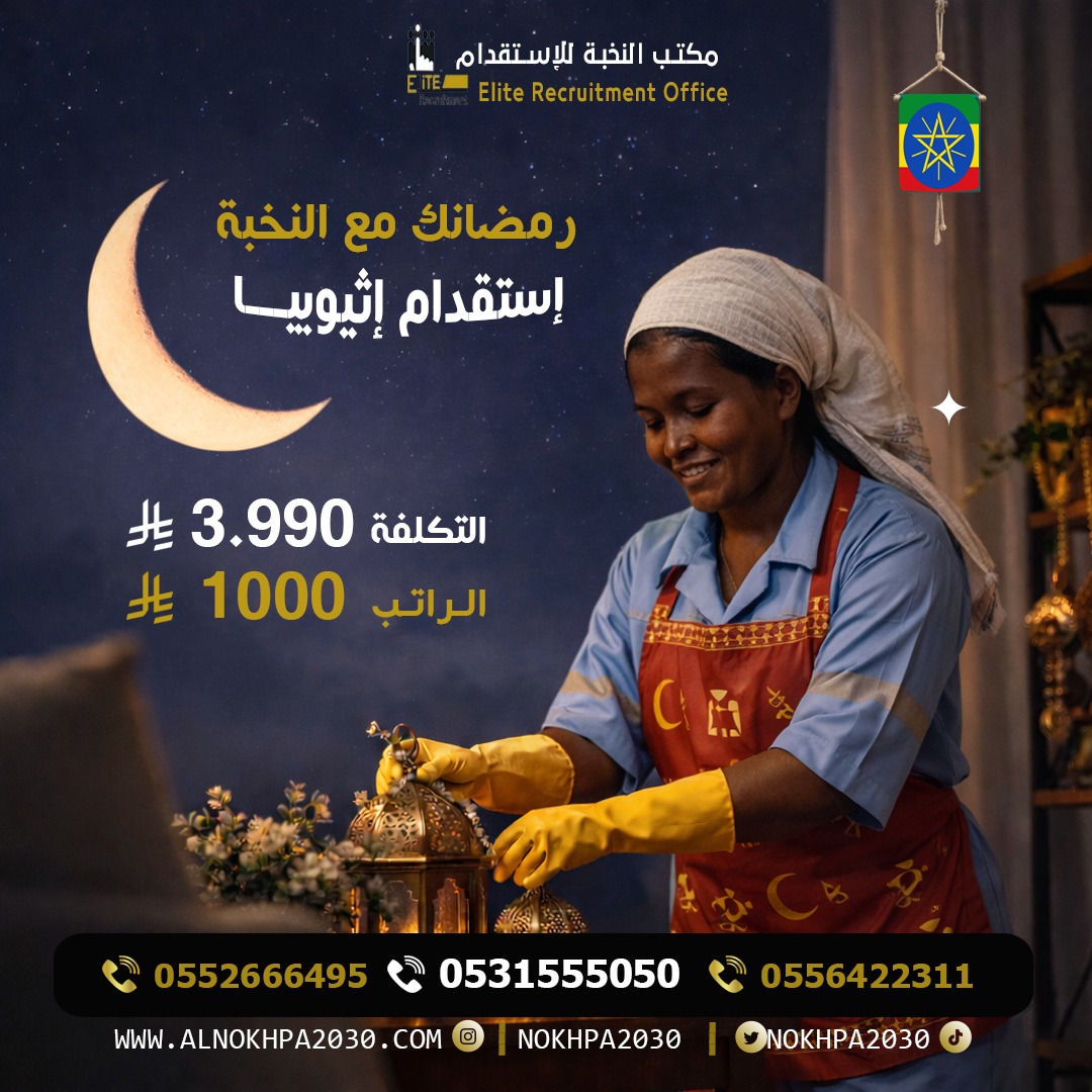 استقدام إثيوبيا 3990 ريال – عرض رمضان 2026 | راتب 1000 ريال | مكتب النخبة