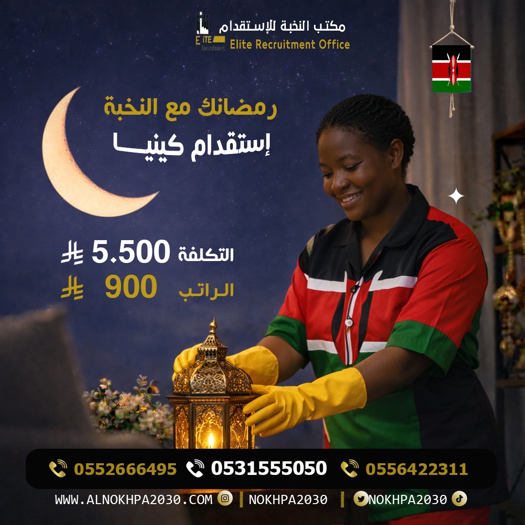 استقدام عاملة منزلية من كينيا بالرياض 2026 بسعر 5500 ريال وراتب 900 – عرض رمضان من مكتب النخبة