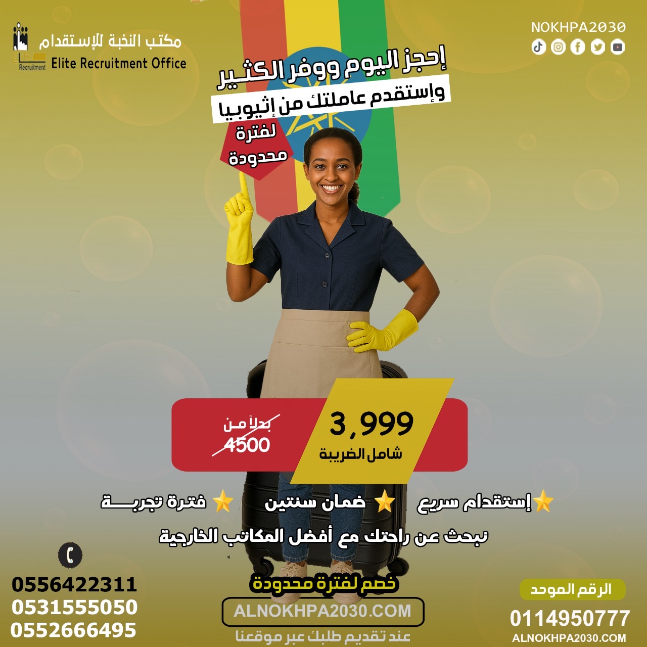 هل تبحث عن عاملة منزلية من إثيوبيا؟ 🇪🇹 مكتب النخبة للاستقدام بالرياض يقدم لك أسرع وأضمن خدمة استقدام عاملات إثيوبيات بأسعار تبدأ من 3,999 ريال فقط شامل الضريبة.