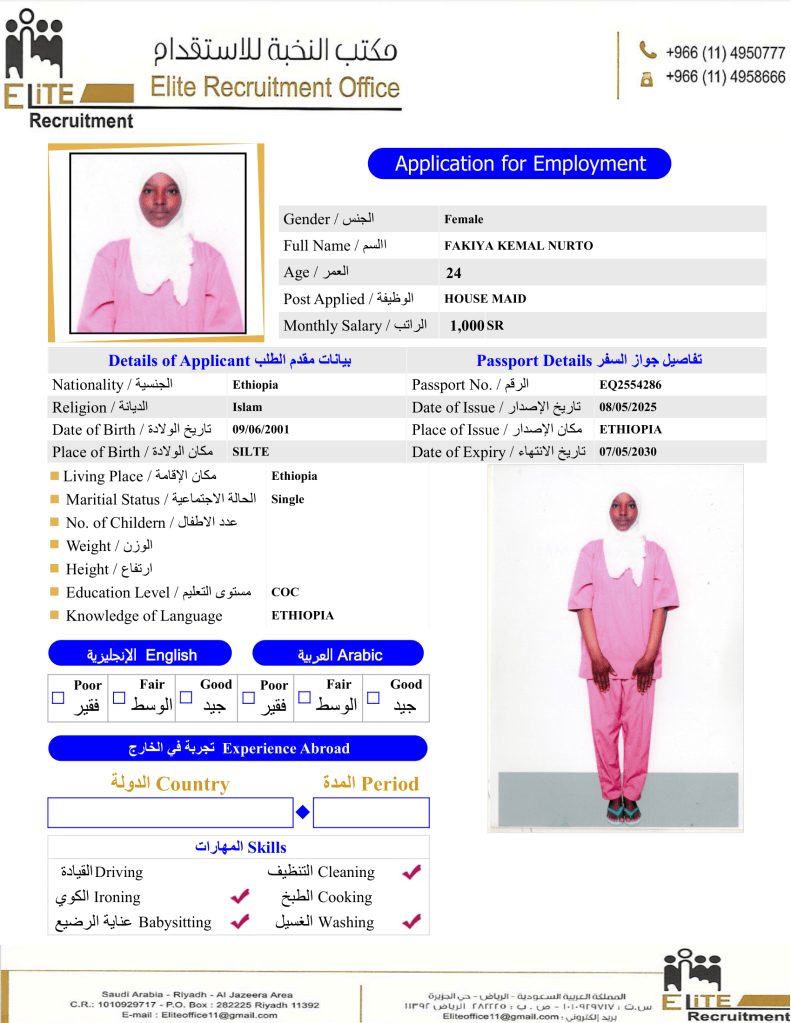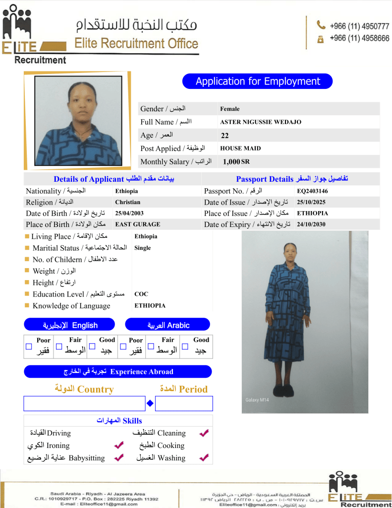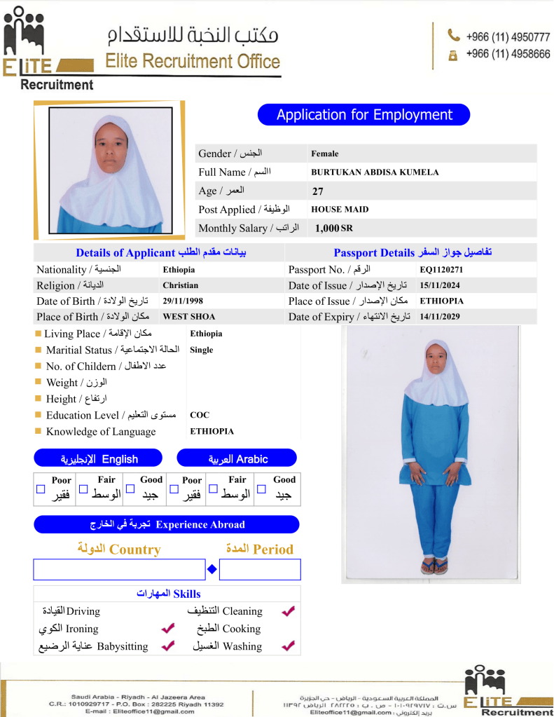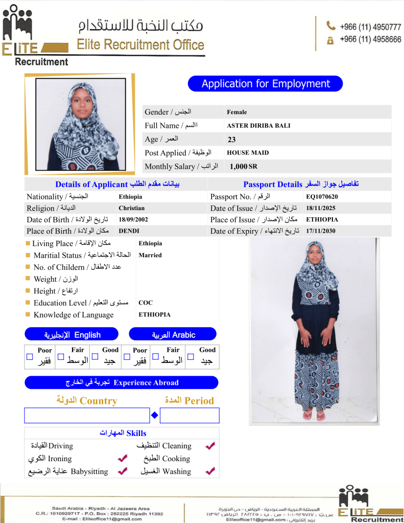 إختر عاملتك المنزلية الإثيوبية عبر متخصصين بمجال الاستقدام من مكتب النخبة خبرة اكثر من 10 سنوات بمجال استقدام العاملة المنزلية بسعر العرض الحالي بالمكتب.
