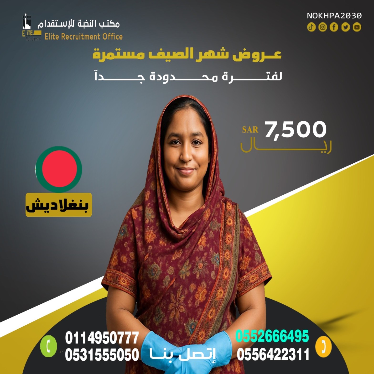 أحدث عروض استقدام عاملة منزلية بنغلاديشية بـ7500 ريال شامل كل التكاليف – صيف 2025 من مكتب النخبة