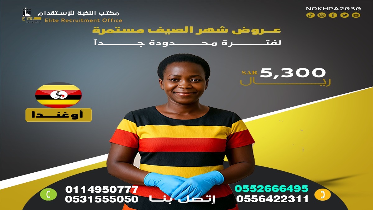 استقدام من أوغندا بسعر 5,300 ريال شامل الضريبة من مكتب النخبة للاستقدام. عرض نهاية العام لفترة محدودة مع إجراءات نظامية عبر مساند وخدمة موثوقة. اتصل الآن 0556422311