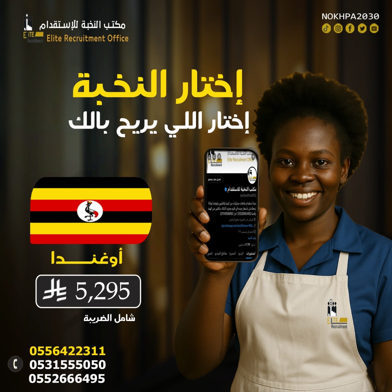هل تبحث عن استقدام عاملة منزلية من أوغندا بموثوقية عالية وسعر مناسب؟ نقدم خدمة استقدام سريعة، ضمان سنتين، فترة تجربة، وسعر شامل يبدأ من 5,300 ريال فقط. احجز الآن من مكتب النخبة للاستقدام لخدمة مريحة وموثوقة في جميع مناطق المملكة